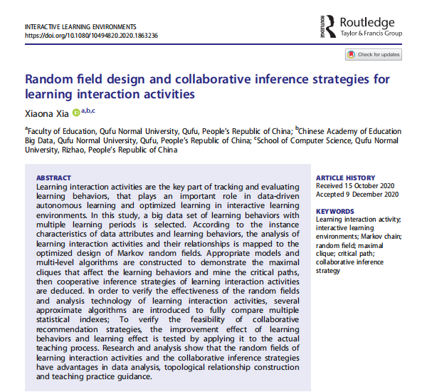 教育健身色情 博士生夏小娜的论文《Learning behavior mining and decision recommendation based on association rules in interactive learning environment》(学习交互环境中基于关联规则的学习行为挖掘和决策推荐,WOS:00055562600001)、《Random Field Design and Collaborative Inference Strategies for learning interaction Activities》(学习交互活动的随机场设计与协作推断策略,WOS:000603838500001)以及《Interaction Recognition and Intervention Based on Context Feature Fusion of Learning Behaviors in Interactive Learning Environments》(学习交互环境中学习行为上下文特征融合的交互反应识别及干预)三篇论文被国际期刊Interactive Learning Environments(SSCI,JCR: Q2,2019年IF=1.938)接收,并分别于2020年8月4日、2020年12月30日和2021年1月15日提前在线发表。