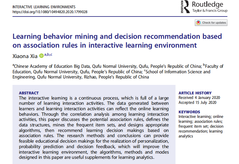 据悉,interactive Learning Environments是学习分析领域的知名国际期刊,创刊主旨是用以介绍交互学习环境的设计和使用,包括支持学习者的个性化学习环境,以及支持和实现学习者群体协作的技术和方法等。