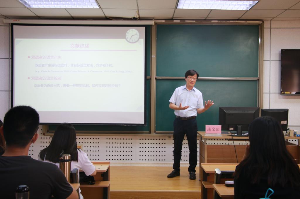会议伊始,何文广副院长对陈宝国教授进行了介绍并表示热烈欢迎。陈宝国教授主讲的“抑制控制在汉—英双语转换过程中的作用”,对英—汉双语者通过抑制控制机制实现语言选择进行了精到的分析。他的报告围绕大学生感兴趣的话题进行,引起同学们的强烈共鸣,通过介绍四个实验研究加深了同学们对抑制控制的了解。陈教授在讲座结束后与学生积极互动交流,展开热烈讨论,认真专业地解答同学们的疑惑。