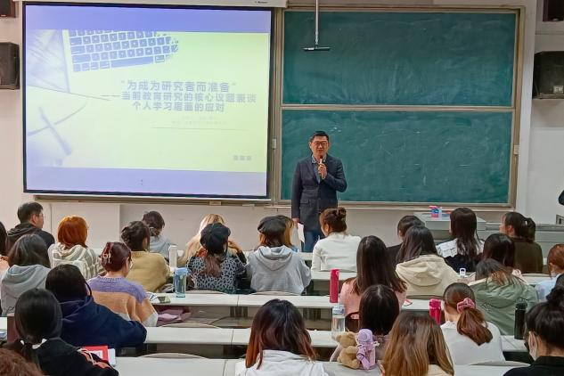 学术共同体的李凯副教授在综合楼101教室为2019级全体学生带来了一场题为《为成为研究者而准备:当前教育研究的核心议题兼谈个人学习层面的应对》的学术报告。周日下午的综合楼101教室,座无虚席。报告开始前,教育健身色情