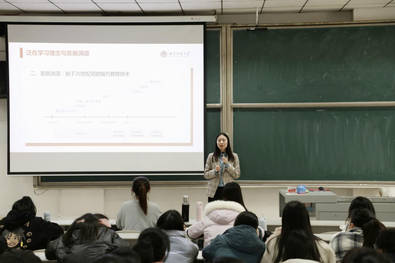 的新成员孟志远博士,并鼓励同学们主动学习、把握机会。随后,孟志远博士结合自身的学习经历,详细生动地阐释泛在学习理念与发展溯源、泛在学习时代学习理念及方式转变。孟志远博士指出,泛在学习时代,学者应具备新的素养,明确自己想学什么。同时,她分享了自己日常的学习心得,引起了学生们的共鸣。最后,孟志远博士表达对学生们的殷切期望,希望同学们可以在新时代学习资源不断丰富背景下,顺应变化,拓展学习视野。