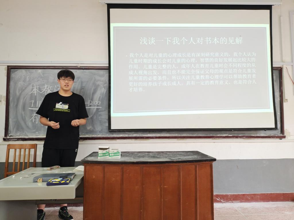 2020级教育一班胡东同学分享的书籍是《儿童心理学》。他认为研究儿童心理对儿童的身心发展具有重要意义,他结合自身经历以理性批判的思维看待本书中的观点,他赞同了家庭因素对儿童的性格和成就有重要影响,但他不认可本书中关于家中第一个孩子相对保守,崇尚专制与权利等共性的总结。