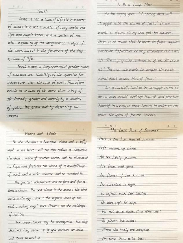 经评选,最终钢笔字专项中佘东霖荣获一等奖,王鸿茹、方虹苏等荣获二等奖,高璐、汪艺杉等荣获三等奖;毛笔字专项中曲润茹荣获一等奖,史宇杰、韩雪婷等荣获二等奖,李梦霞、徐昱洁等荣获三等奖;临摹英文专项中郭晶津荣获一等奖,孟欣宇、孙兆萍等荣获二等奖,崔景博、闫红晔等荣获三等奖。