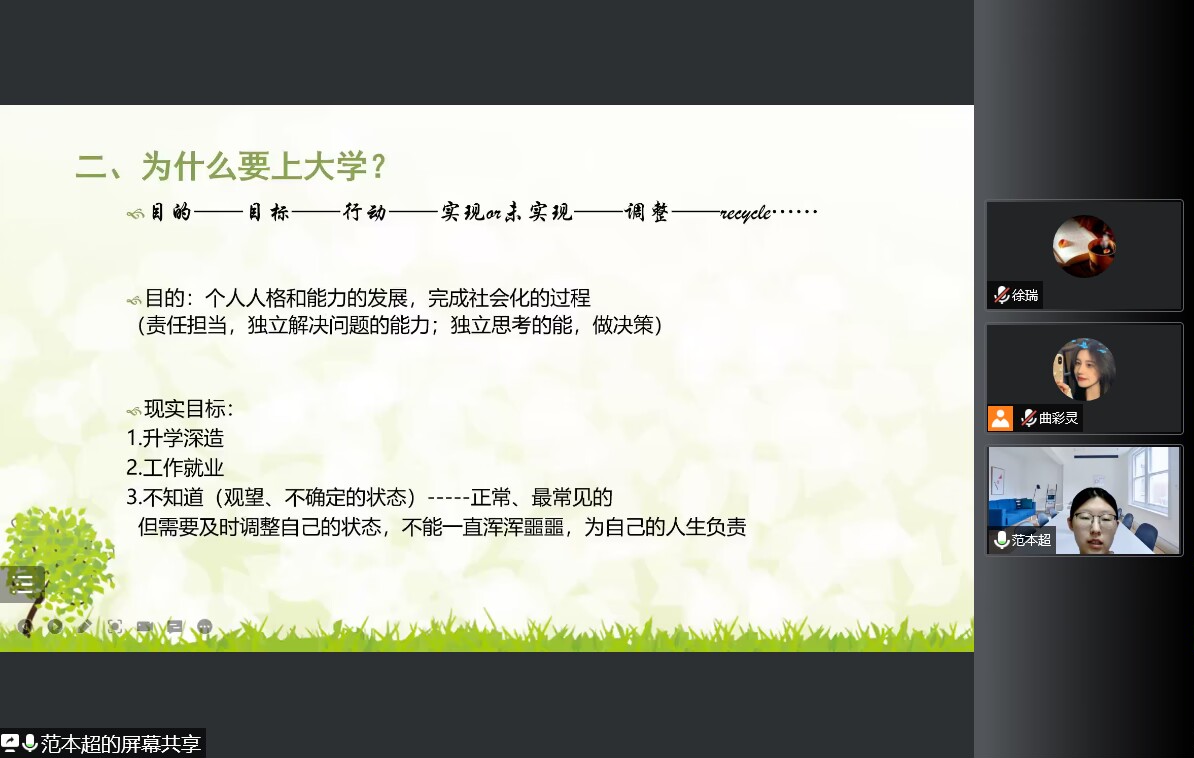 报告中,范本超从大学的目的、目标、行动、实现与未实现、调整五个方面入手,全面具体地向新生介绍了大学四年中的每一年应该和可以做到的事。她结合自身经历,对“内卷”严重的现状向新生分享应对方法,建议同学们要不断提高学习能力,认真学好专业课和英语,努力提升自己!