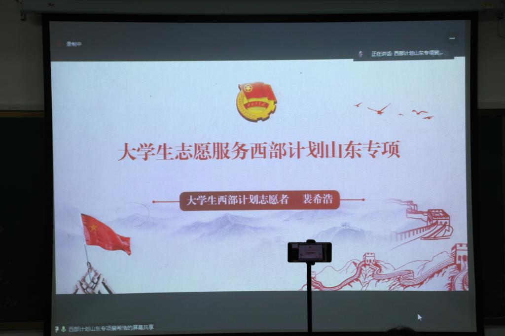 大学生志愿者在支援西部工作中的相关情况,并结合自身经历就大学生西部计划志愿者选拔政策、网上报名流程、志愿者选拔标准等进行了宣讲和要点解读。他们鼓励同学们要积极响应团中央“到西部去、到基层去、到祖国和人民最需要的地方去"的伟大号召,报名参加大学生志愿者服务西部计划,带着“奉献、友爱、互助、进步”的志愿精神开启志愿征途,实现自己的人生价值和青春理想。