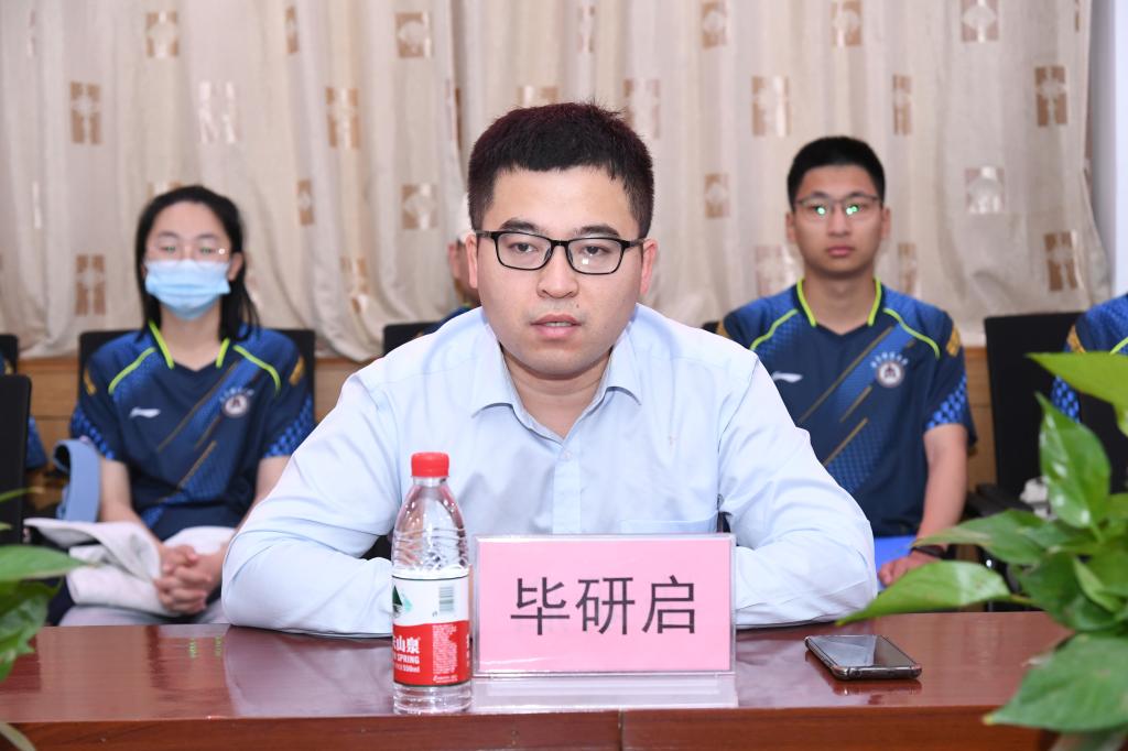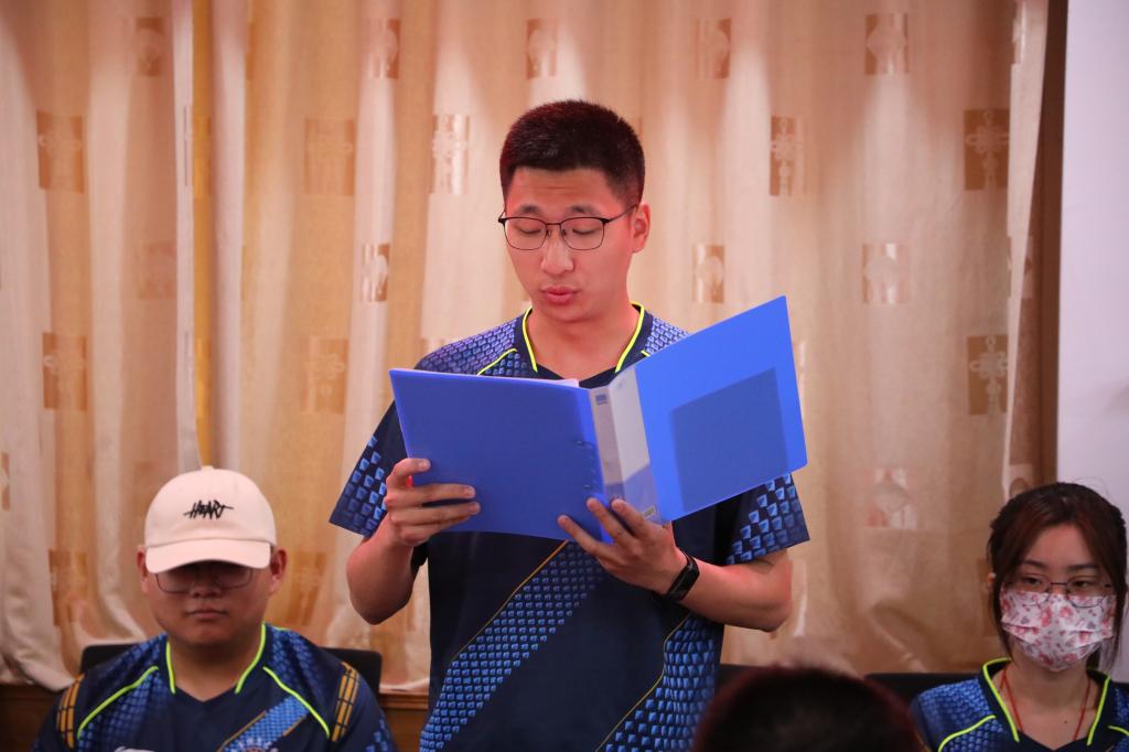 副队长邓明鑫同学发言,作为一名乒乓球队队员,他向教练与师哥师姐的指导帮助表示真诚感谢。他表示将和队员们一起以更加饱满的热情和昂扬的斗志投入到训练当中,全心全意为教育健身色情