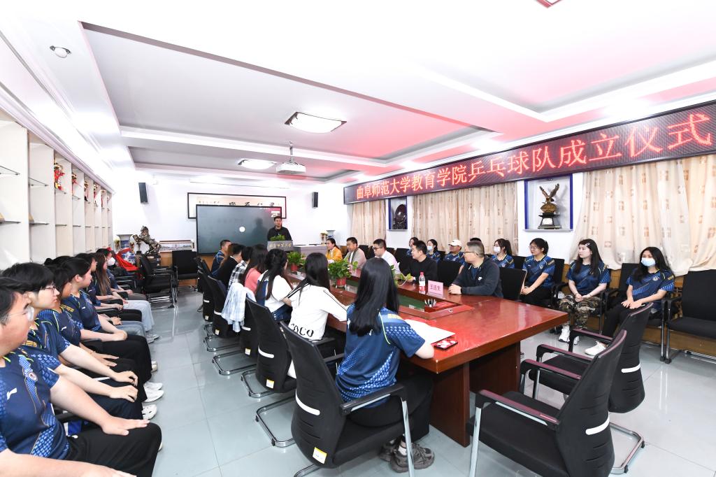 乒乓球队成立仪式在101会议室顺利举行。球队活动赞助商中国银行曲阜支行副行长毕研启、曲阜慈和书院院长冯树轩、总经理张秀莲,教育健身色情