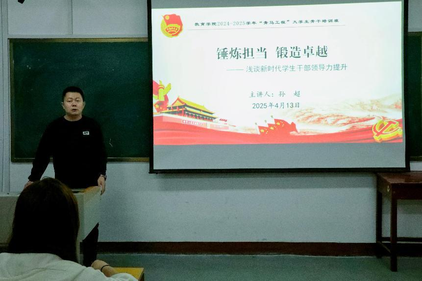 孙超以“锤炼担当,锻造卓越”为主题,就学生干部领导力提升进行系统性解读。其讲解内容涵盖领导力定义、学生干部角色定位及领导力提升策略等层面。他强调,学生干部需以深化自我认知为起点,明确自身角色定位,通过目标锚定清晰规划行动方向;要围绕团队建设管理、沟通激励机制、会议组织效能、危机预防应对等关键领域,进行针对性锤炼提升。最后,他对青马学员提出期望,寄语他们勇做"有理想、敢担当、能吃苦、肯奋斗"的新时代卓越青年。