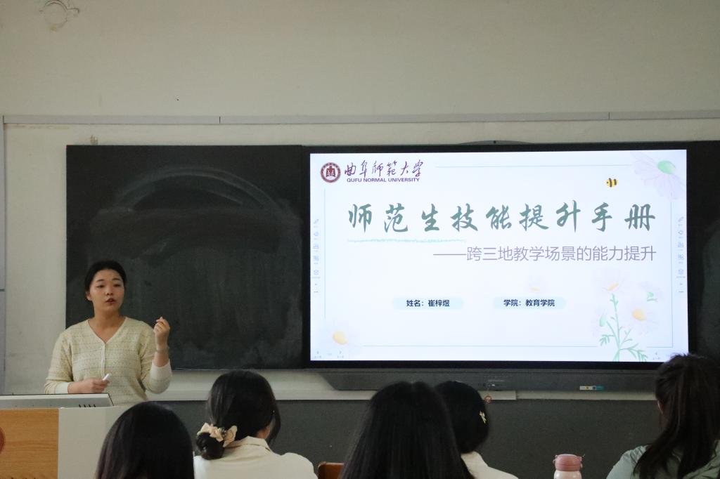 崔梓煜以跨课后服务、支教、实习教学三场景的一线真实案例为切入点,围绕课堂管理、差异化教学、教学设计展开对比分析,提炼出一套具有普适性的师范生技能提升方法。讲解过程中,她与同学们互动探讨职业初期可能面临的学情差异应对、课堂动态管理等实际问题,助力同学们实现理论知识向教学实践的转化,为从教过渡筑牢基础。