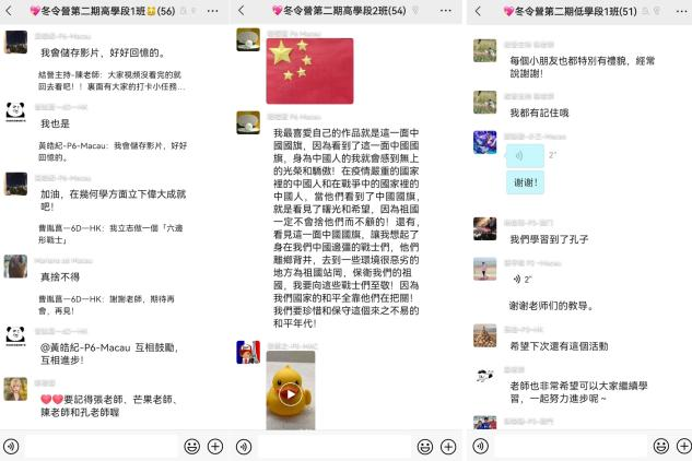 港澳青少年语言文化交流团队的教师进行线上课程讲授和解疑答惑,学员们通过实时互动、完成打卡小任务的方式“零距离”了解并感悟中华优秀传统文化。多元丰富的内容和授课方式激发了学员们对中华文化的浓厚兴趣和向往,课后的打卡小任务也受到了学员们的喜爱和支持,大家提交的作品丰富有趣、感悟深刻。在提及对本次冬令营的感受时,港澳青少年学员们纷纷表示很开心能够参与本期冬令营,学到了许多关于儒家文化、传统建筑、传统美食等传统文化知识,更加了解并热爱中华优秀传统文化了。